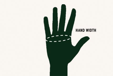 LONGUEUR : La main ouverte, mesurez la main dominante depuis l'extrémité du majeur jusqu'au pli à la base de la paume.