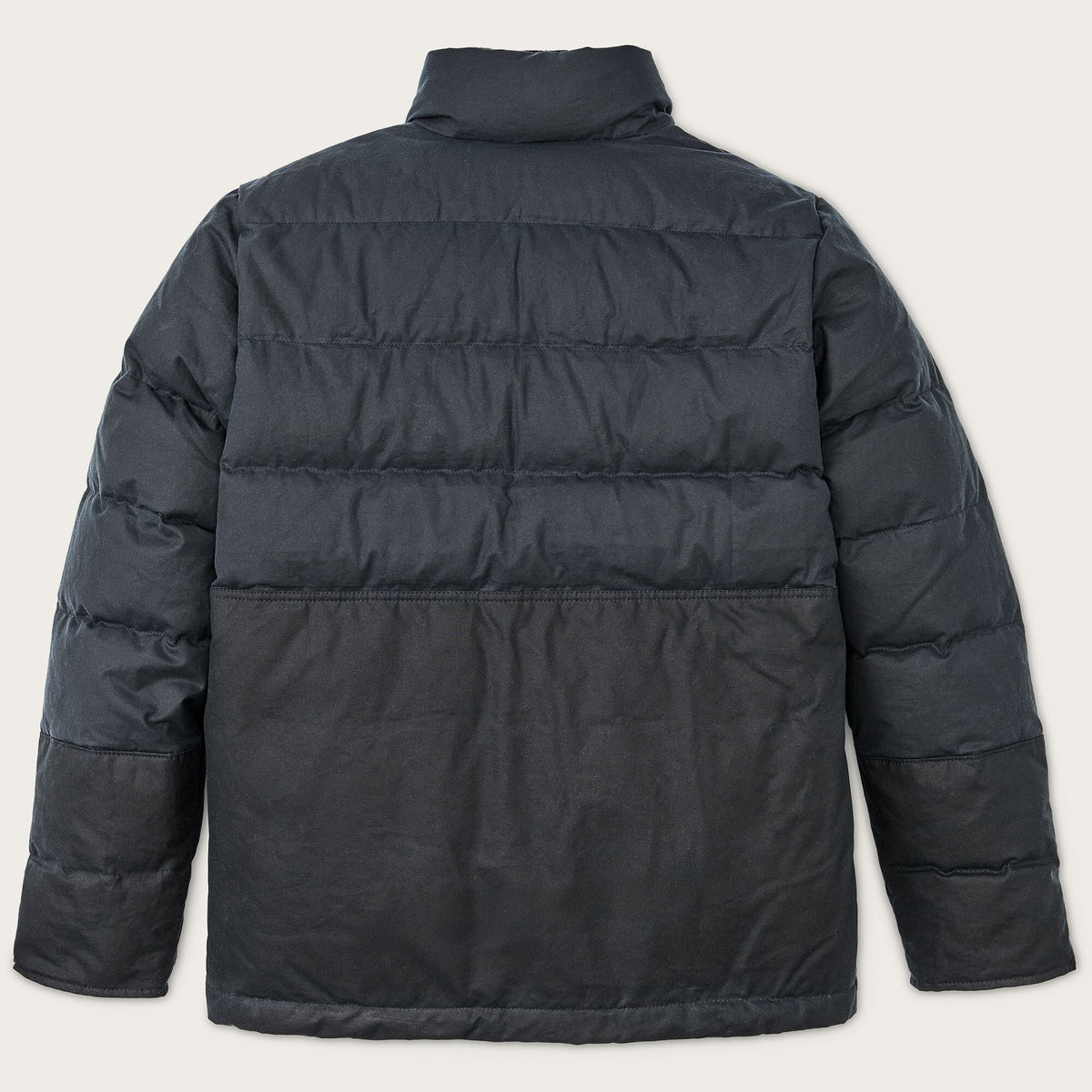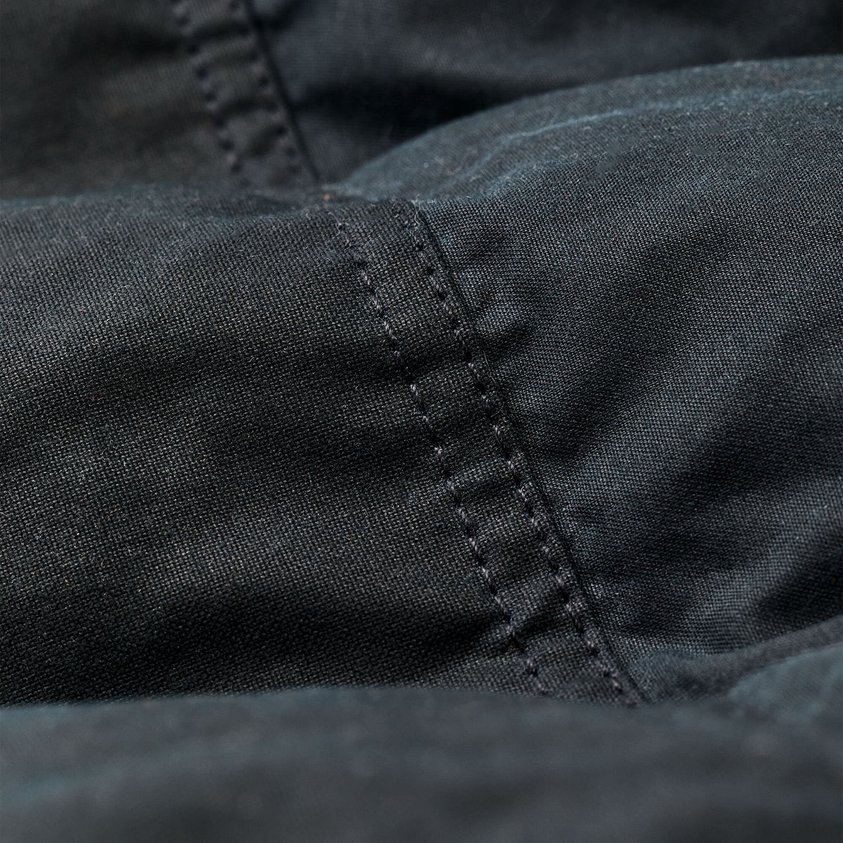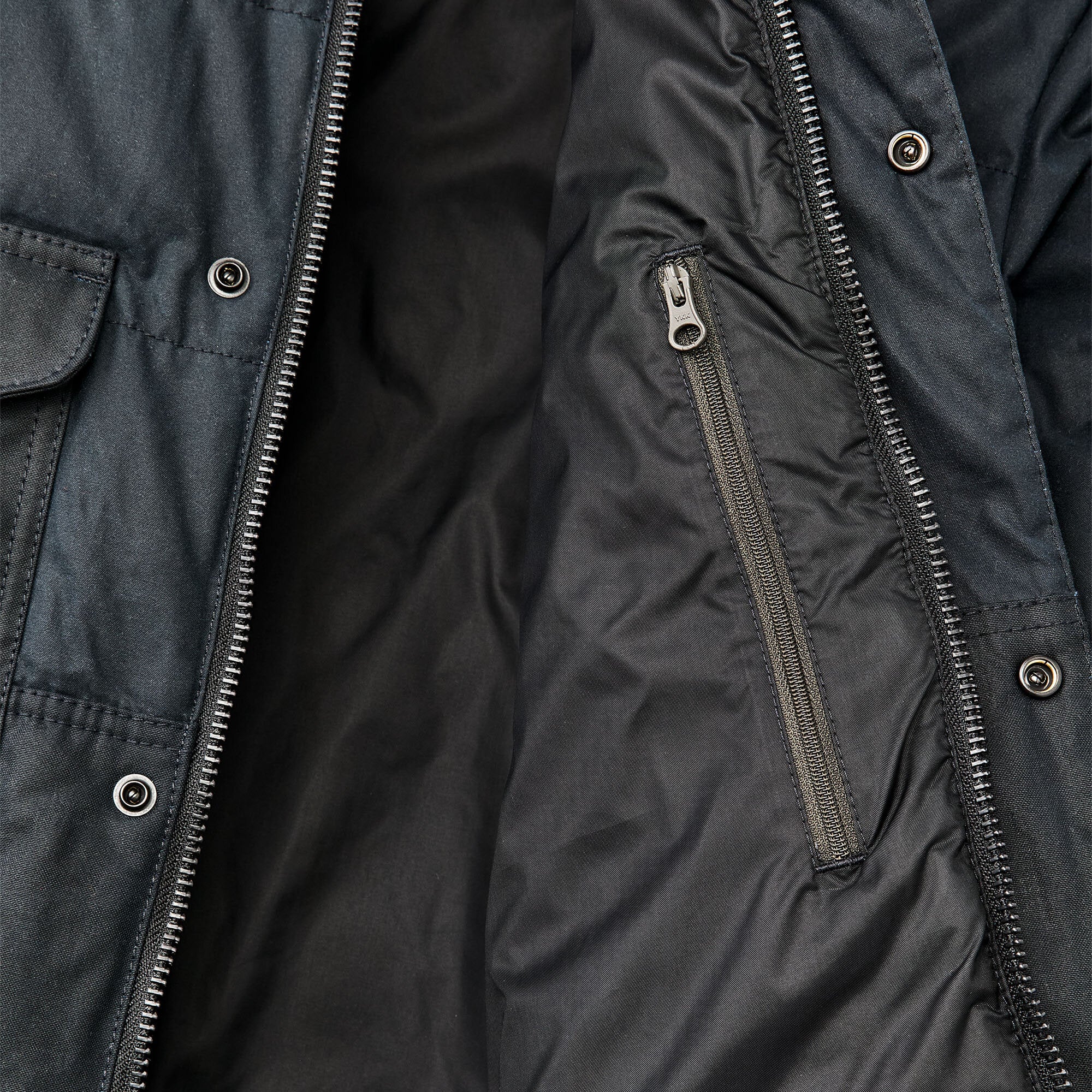 Coton ciré Heritage combiné à une isolation légère comme une plume. Tissu Cover Cloth 100 % coton 227 g à finition huilée + Tissu Shelter Cloth 100 % coton 312 g à finition huilée + duvet 650 FP + doublure en nylon + doublure de col 100 % laine