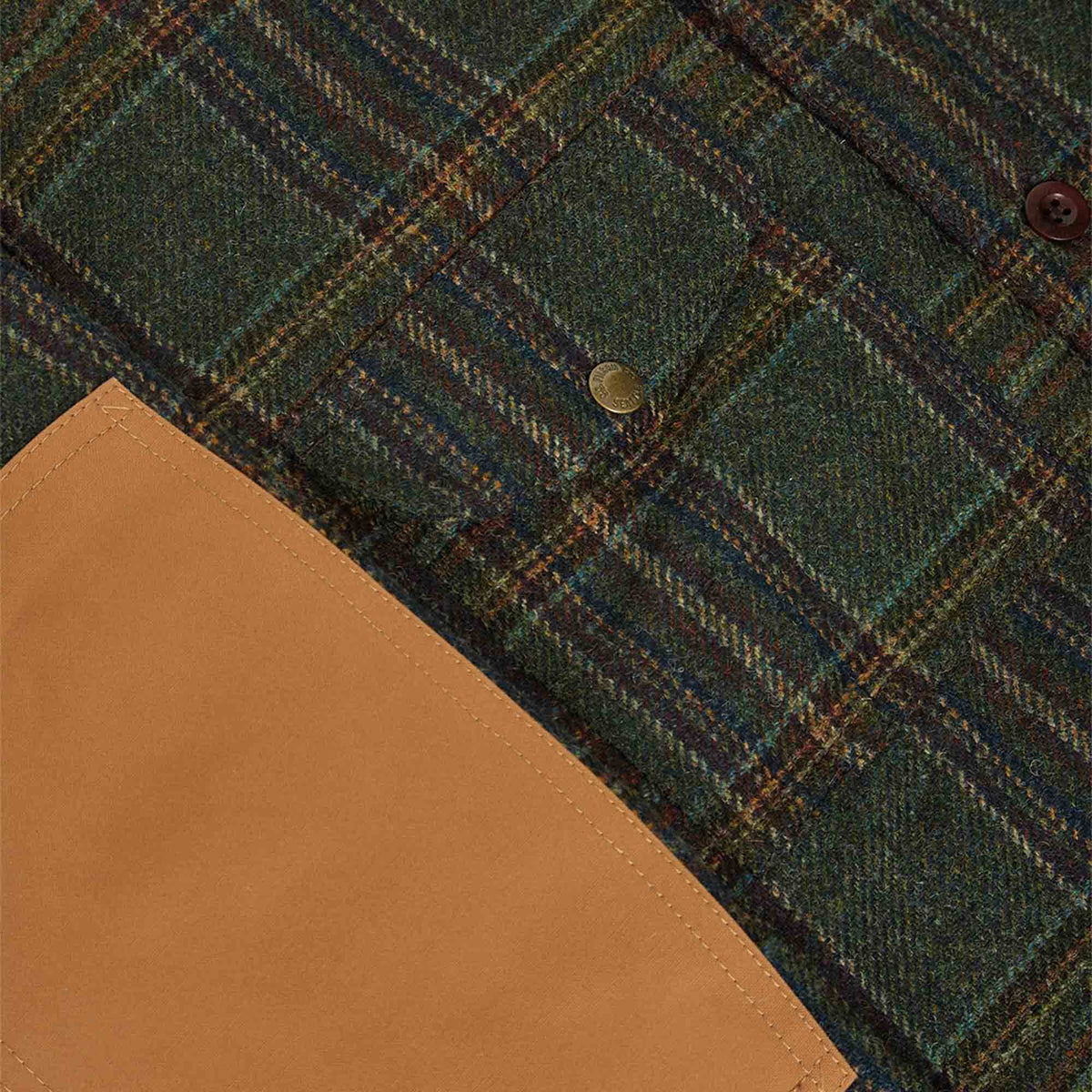 La chemise Filson × Junya Watanabe MAN en laine et cuir est confectionnée en laine de qualité supérieure avec des détails en cuir. Elle présente un design contrasté entre l’avant et l’arrière ainsi que des renforts de coudes en cuir. Deux poches poitrine à rabat et à fermeture par bouton ajoutent une touche fonctionnelle à cette confection raffinée.