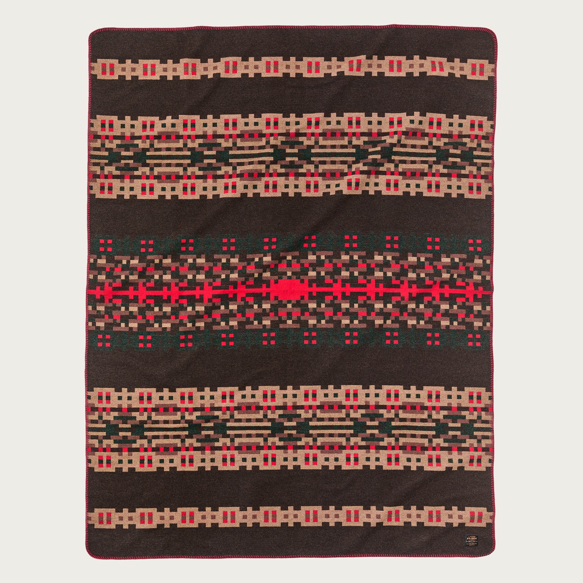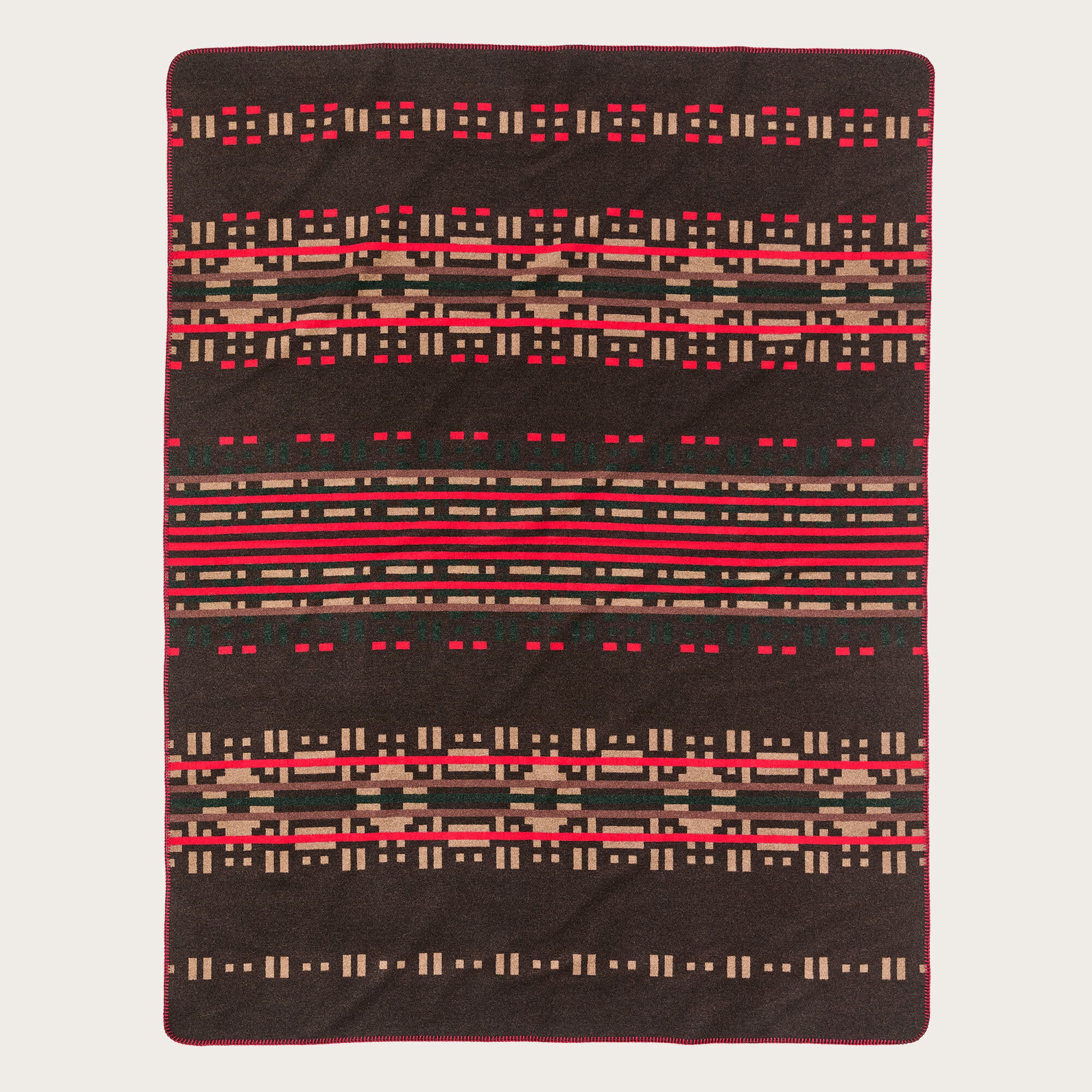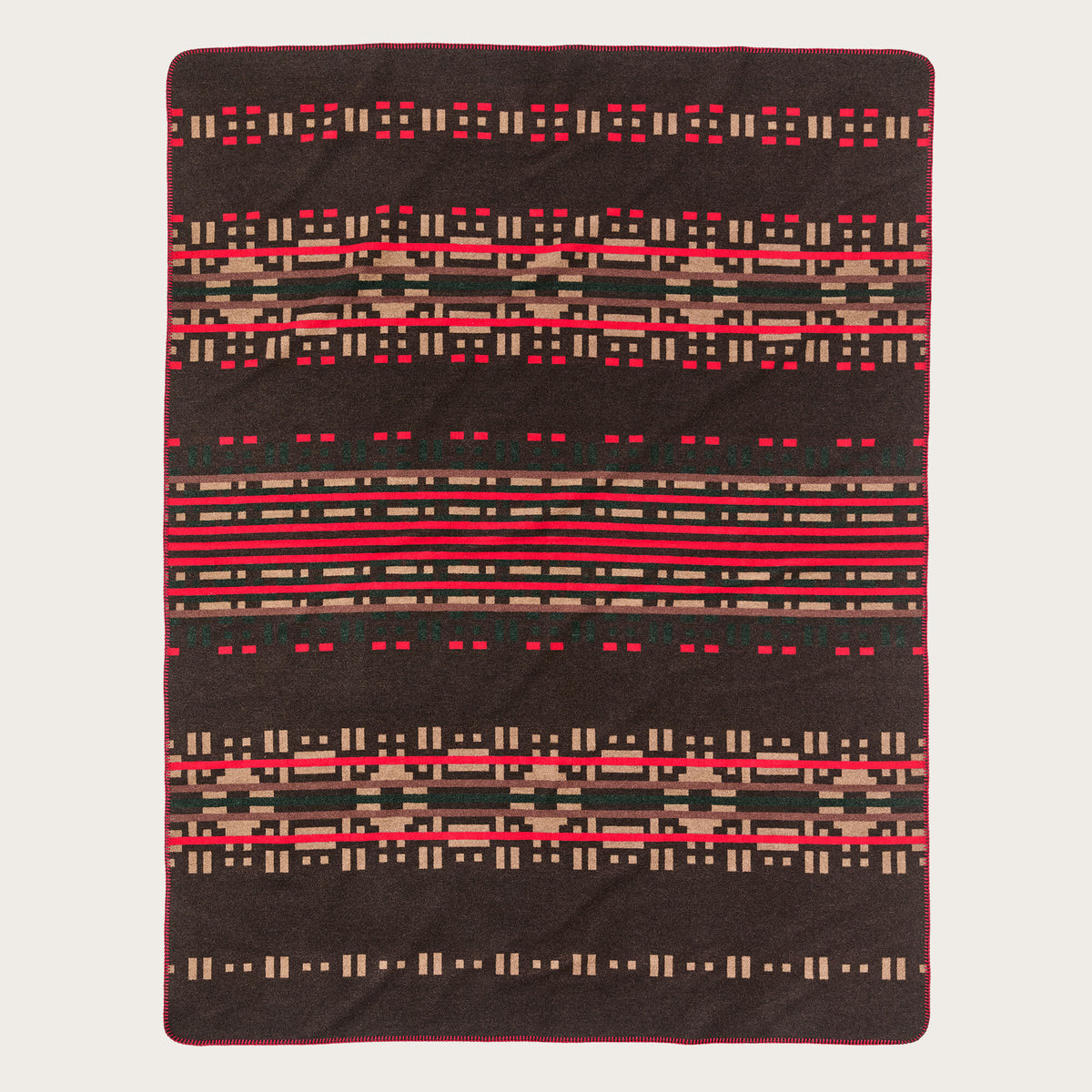 Aussi douce que chaude, cette couverture est fabriquée en Italie à partir d'un mélange de laine de première qualité. La laine offre une résistance pour des décennies de chaleur et est mélangée à 11 % de coton pour un confort sur la peau. Les graphismes personnalisés tissés en jacquard évoquent notre héritage, qui consistait à équiper les pionniers et les explorateurs du nord-ouest du Pacifique et de l'Alaska.