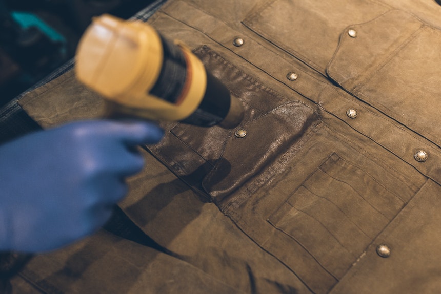 1. Clean all dirt and debris from garment. Waxed cotton can be hosed off and allowed to dry at room temperature before re-waxing. If dirt is dry and caked onto the garment, a stiff nylon-bristled brush works well to remove the debris. Be sure to pay special attention to the seams as these areas can trap mud and dirt.