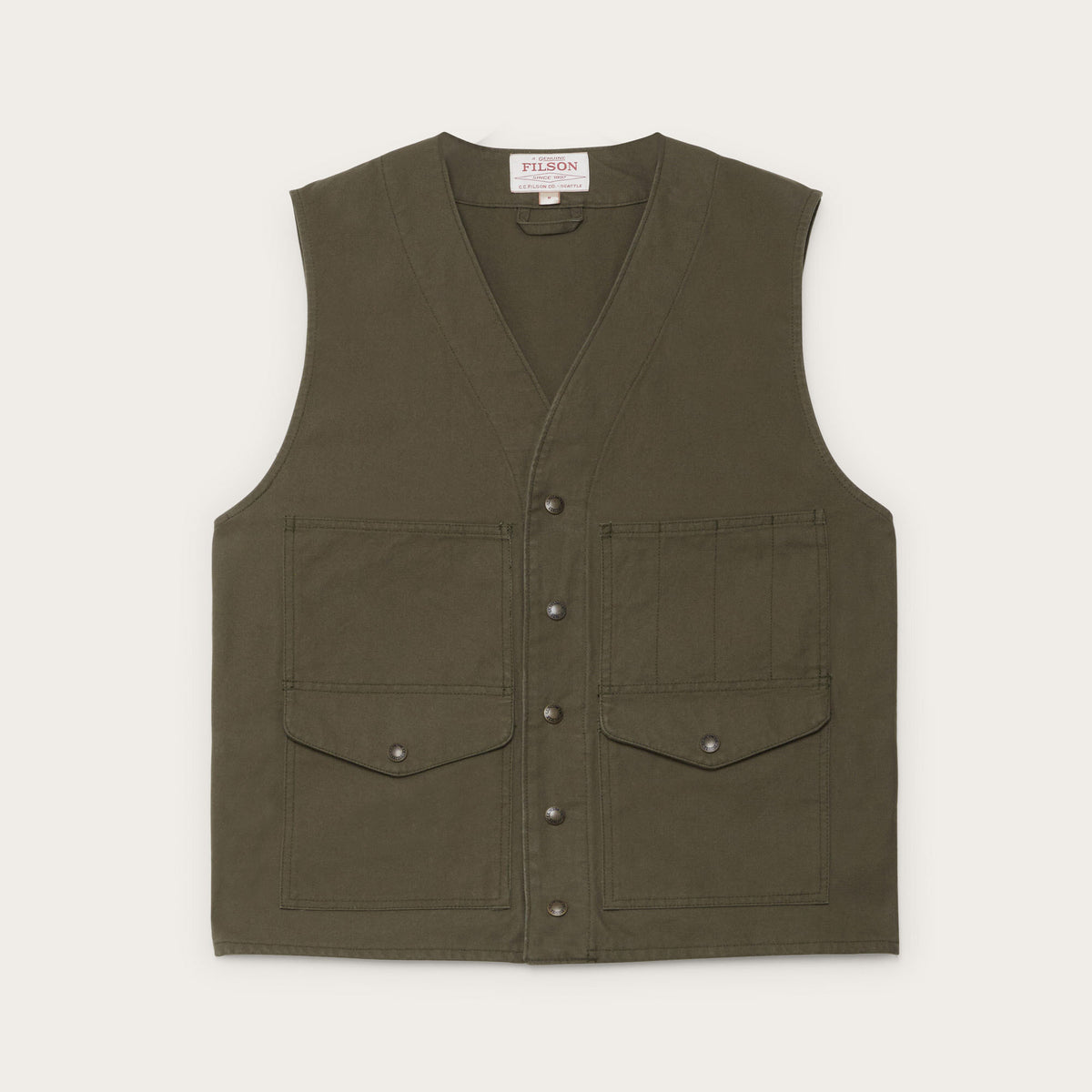 A practical layer built for durability, the Dry Tin Vest is made from Tin Cloth, Filson’s tightly woven canvas known for its resistance to abrasion, punctures, and tearing. The dry finish offers structure without added weight, making it well suited to everyday wear across seasons. It features a button-front closure, two applied front pockets for essential storage, and pen inserts positioned above the pocket for ease of access. Straightforward and dependable, it’s a versatile piece that layers comfortably over shirts or knitwear.