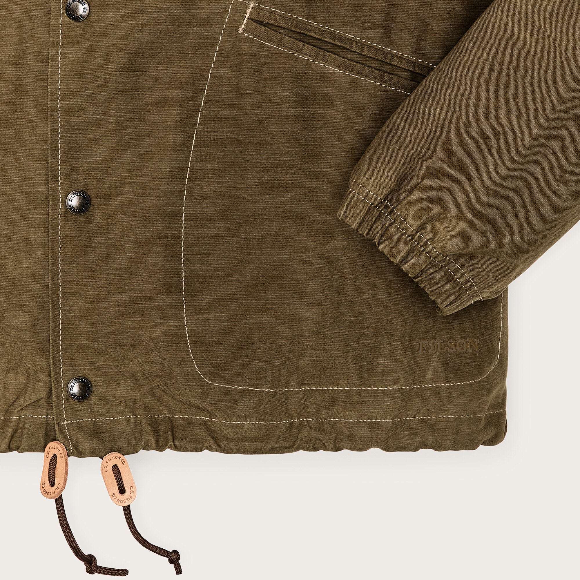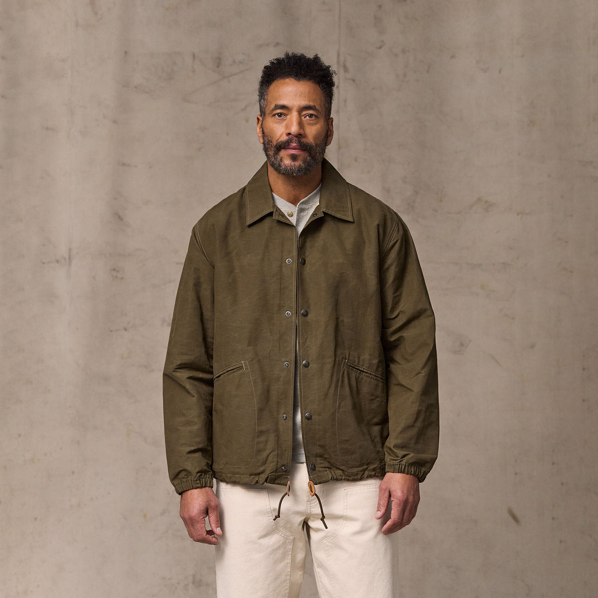 Cut for easy movement, it layers cleanly over a shirt or hoodie without bulk. The snap-front closure makes it quick to throw on and off, while the drawcord hem adjusts to seal out drafts. Angled hand pockets provide storage and warmth on cool mornings.