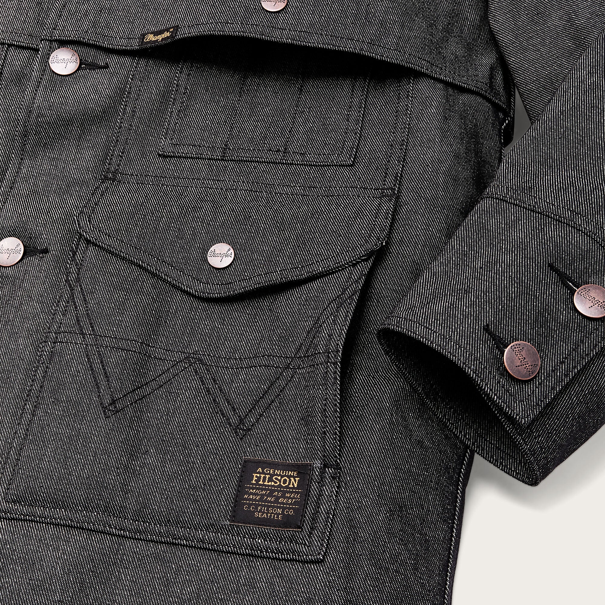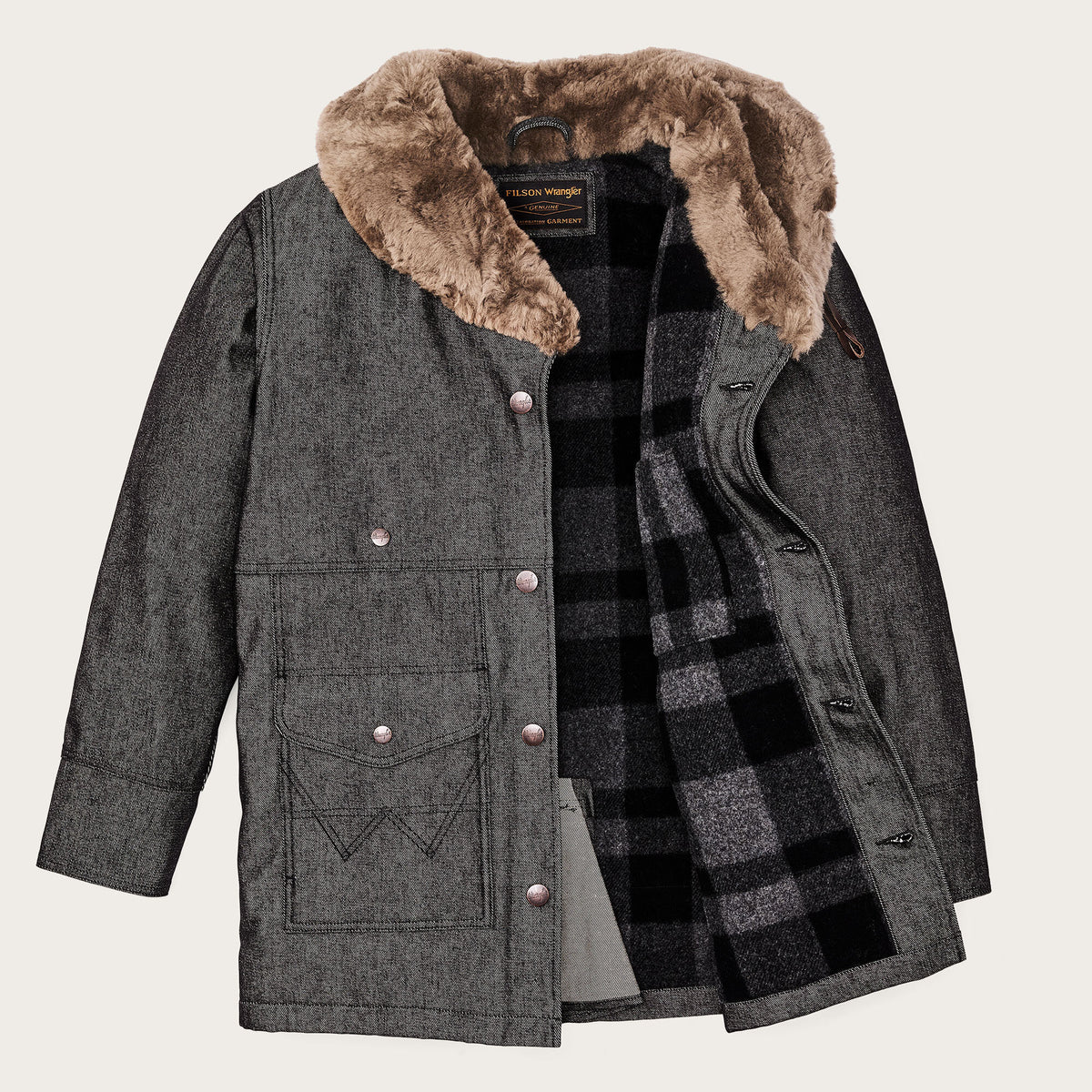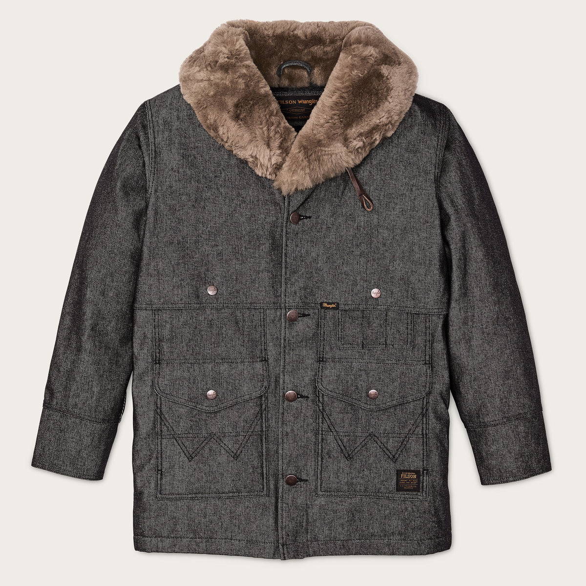 Made with strong 14.5-oz. Wrangler denim, this special-edition Packer Jacket is patterned after our iconic rancher’s coat. The torso is lined with our signature Mackinaw Wool that has provided warmth in the backcountry for more than a century. The sleeves are lined with lightweight PrimaLoft insulation for warmth that slides easily over layers. The sheepskin-shearling shawl collar extends to ear-height for warmth in biting wind and cold. Four front cargo pockets are covered by snapped flaps, and the full-width back packet is large enough for bulky items. Virtually unbreakable metal buttons secure the front and cuffs. Signature Wrangler embroidery on the pockets. Fingertip-length.