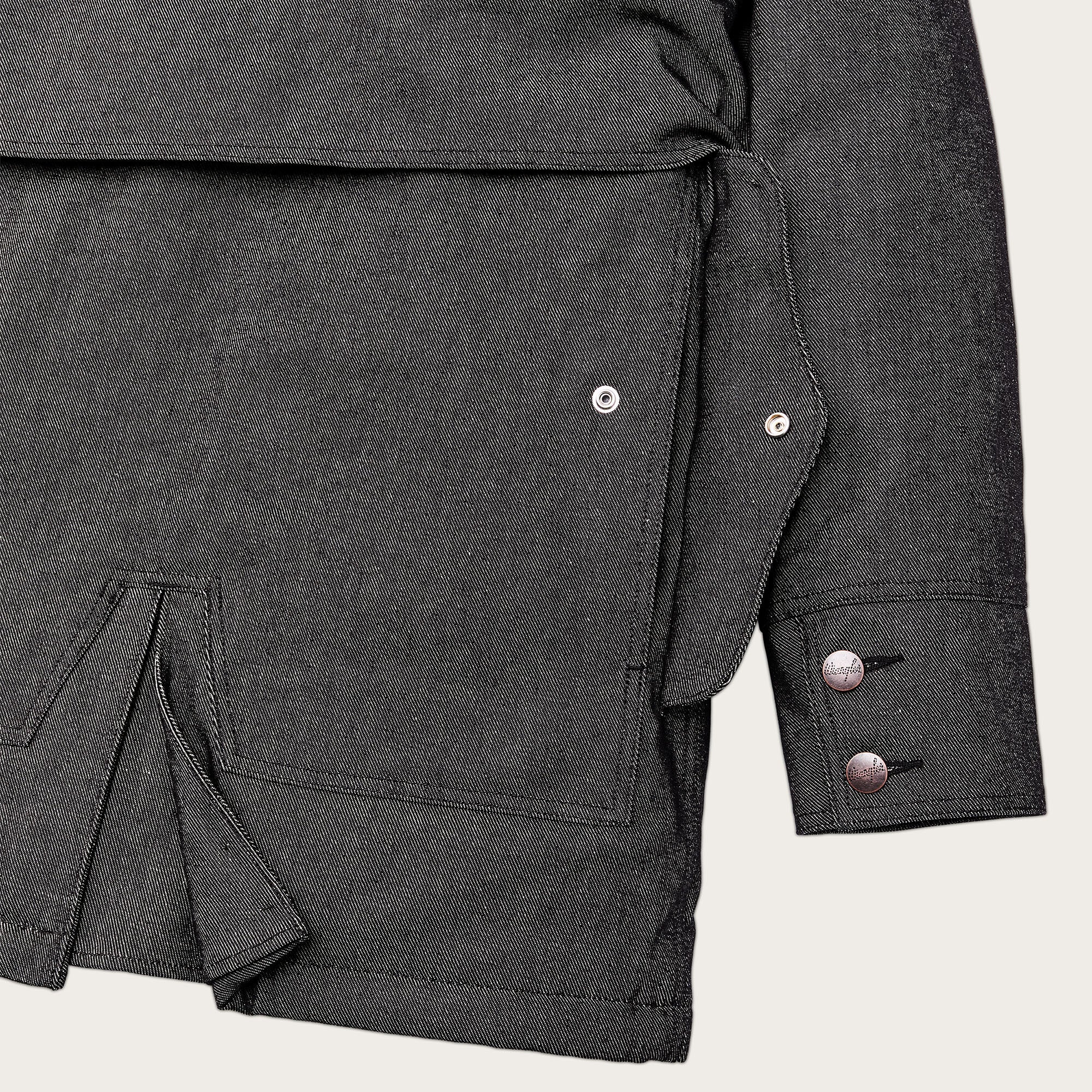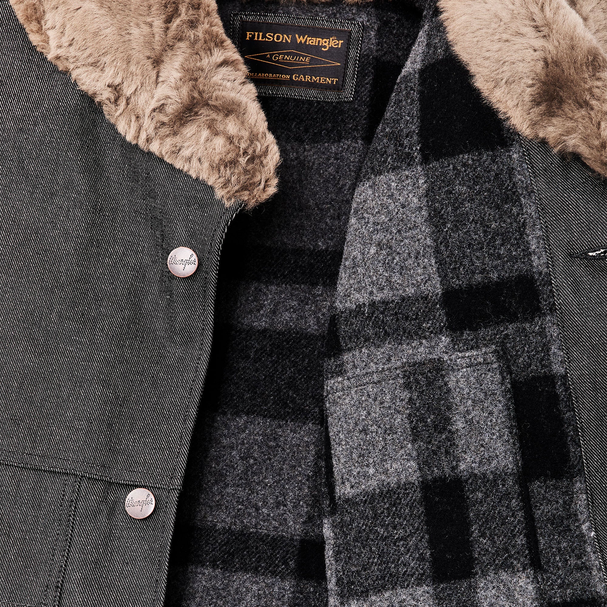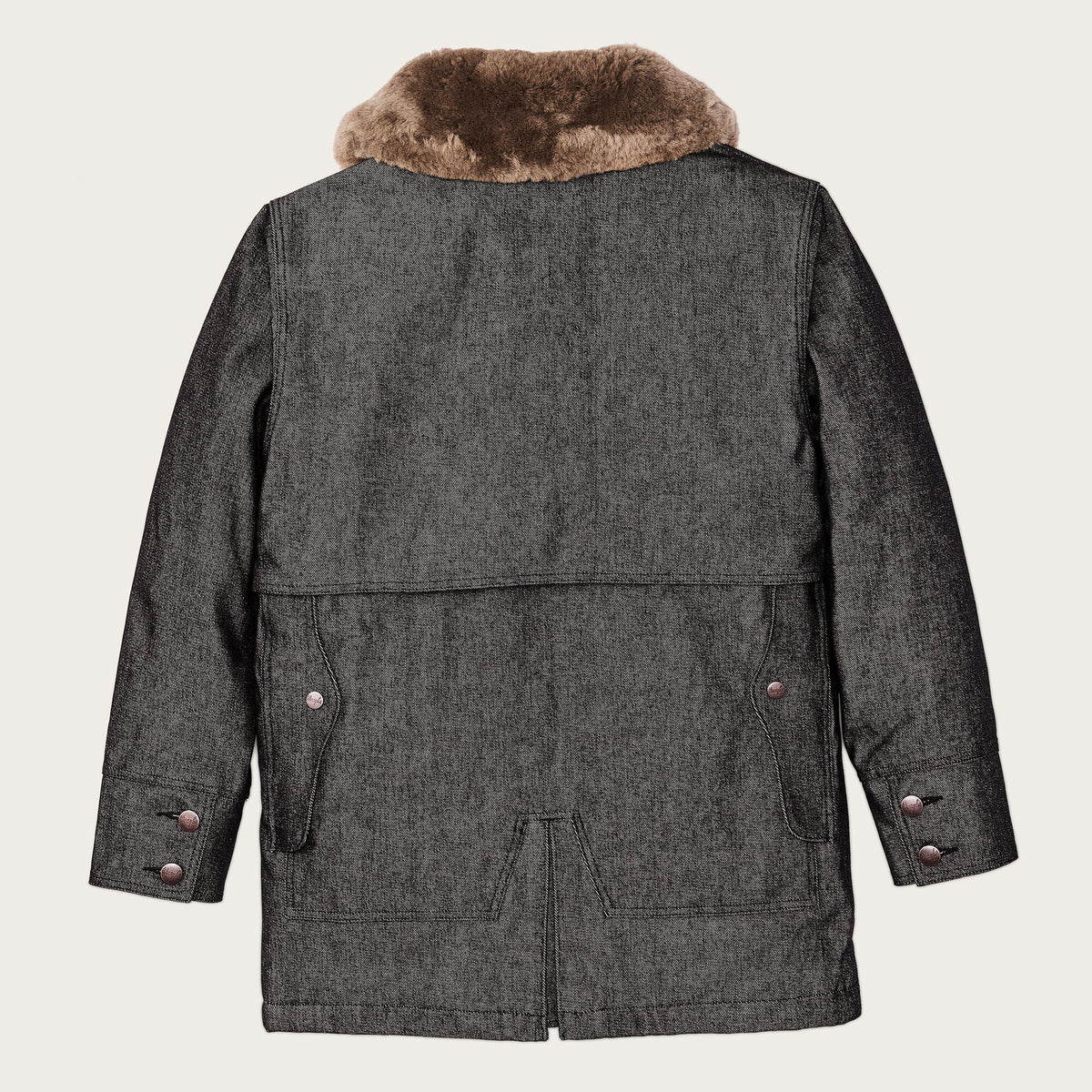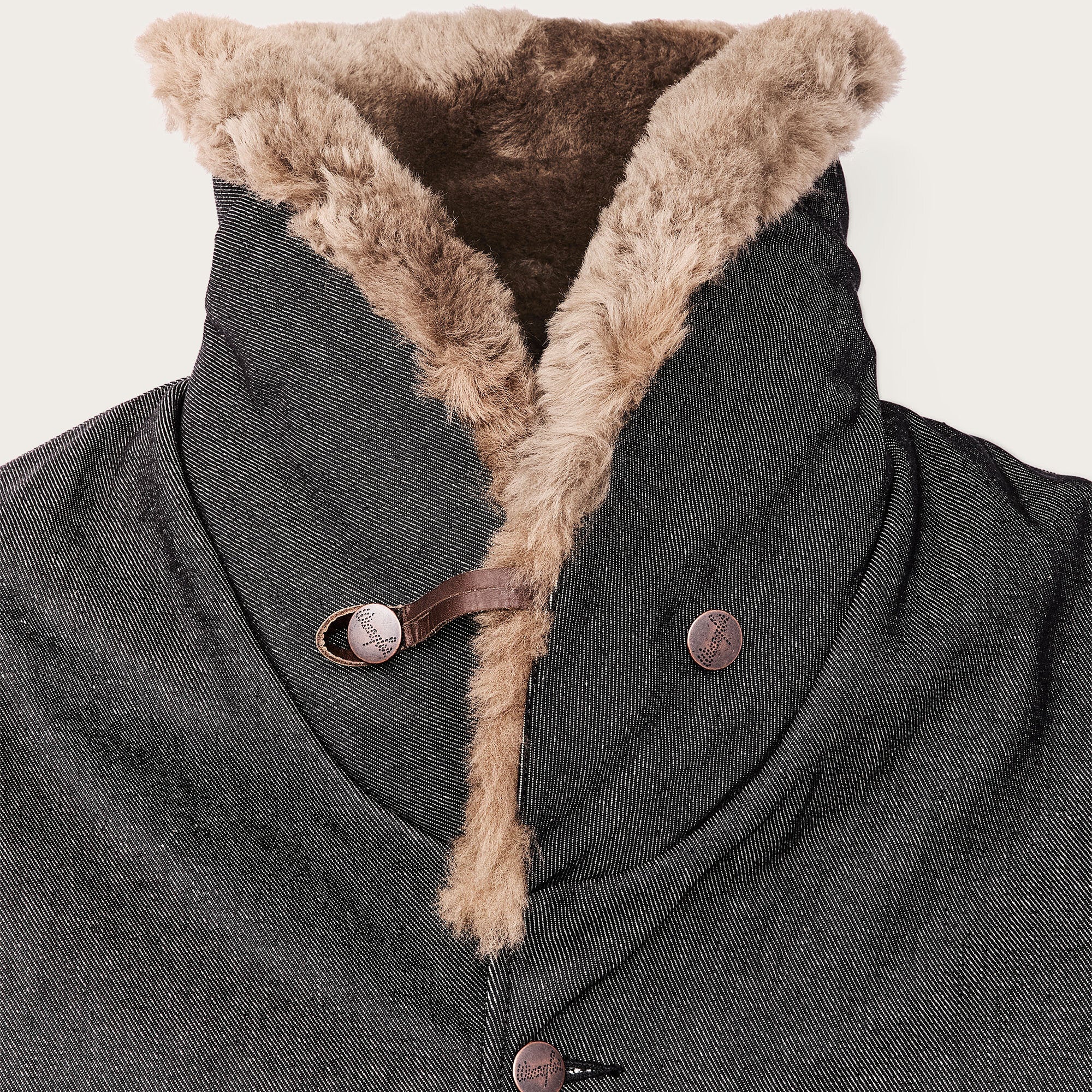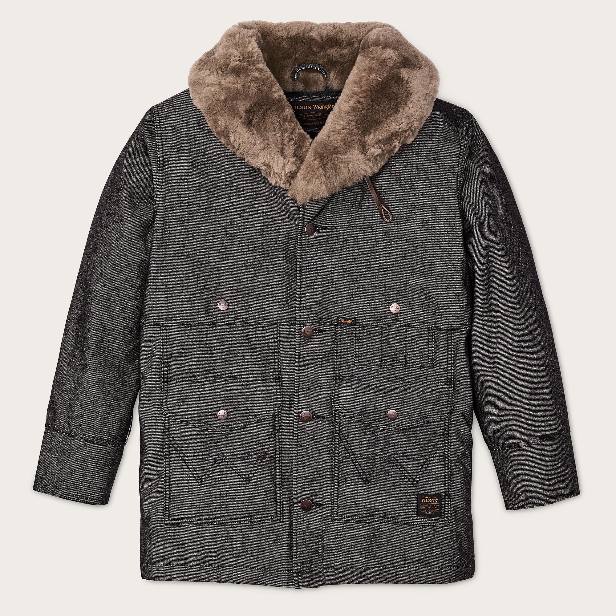 14.5- 100% cotton denim + 24-oz./LY 100% wool + PrimaLoft® insulation + 100% wool sheepskin shearling