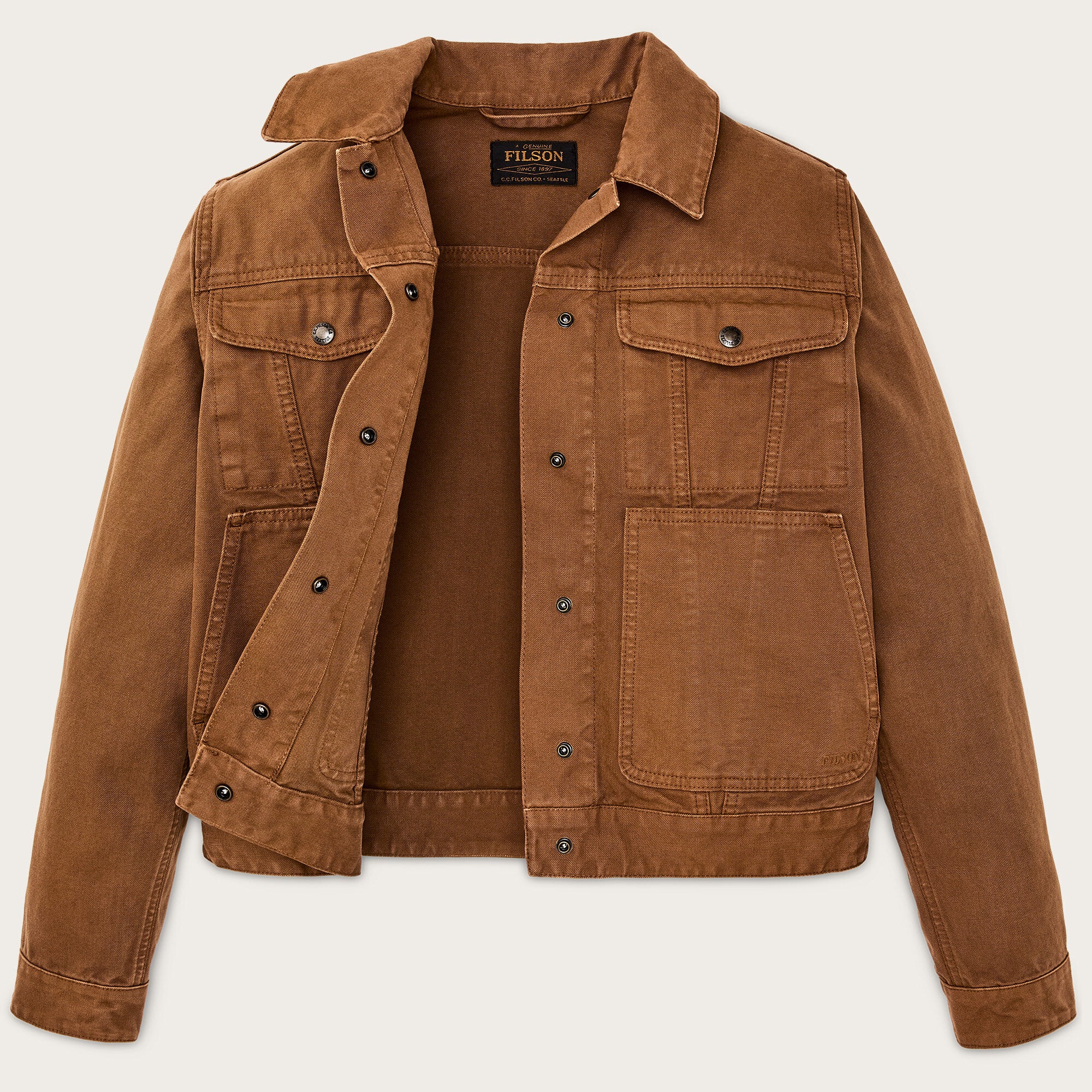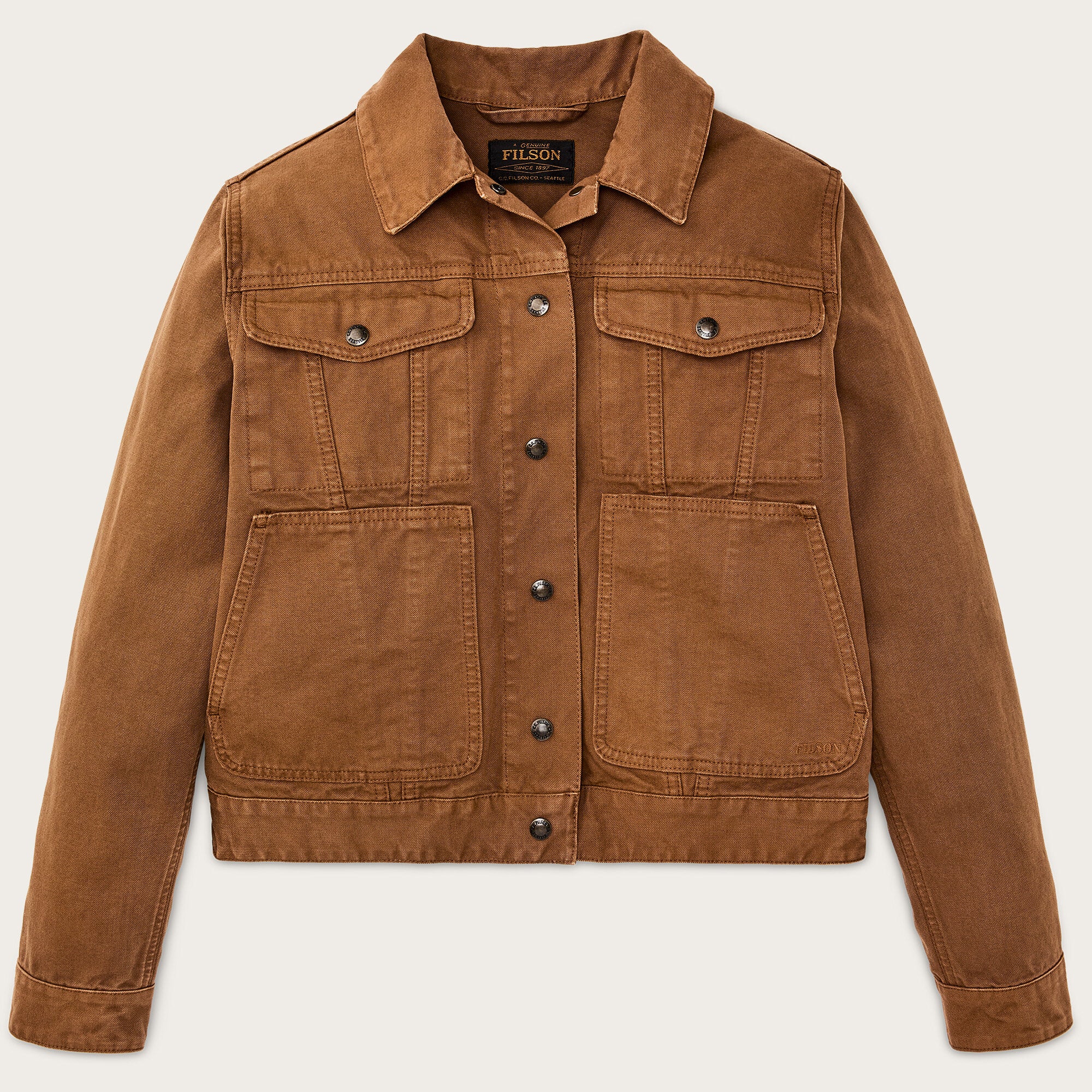 Snap-secure front closure, adjustable cuffs, and waist make it quick and practical in the field or around town. The cropped length sits comfortably at the waist, allowing full mobility whether driving, riding, or hauling gear. Garment dyed and washed, subtle color variations make each jacket unique.